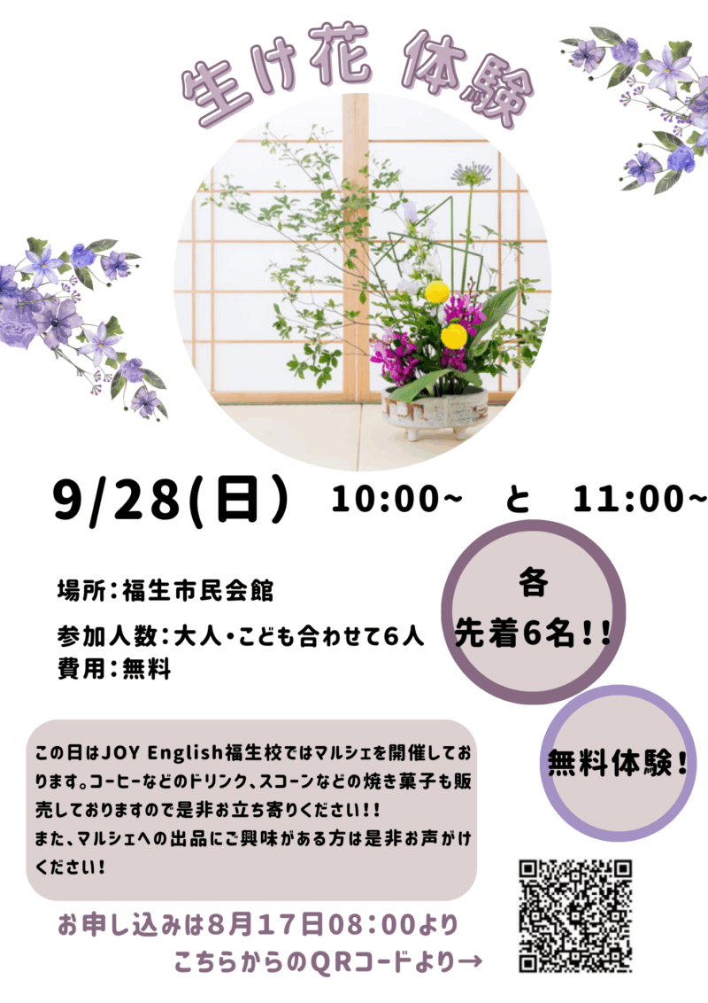 【イベント】マルシェ&生け花教室 投稿日: 2025年9月8日2025年12月24日 投稿者: JOYEnglish こんにちは!福生校です! 9/28(日)はマルシェ開催です! 今回はワークショップ「生け花体験(無料)」を開催します!こちらは先着順になりますのでお申込みをお早めにお願いいたします!(場所は福生市民会館になります。) ワークショップの後は是非教室にお立ち寄りください✨ 皆様のお申込みをお待ちしております。