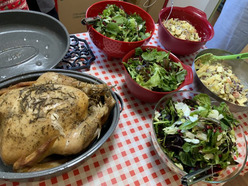JOY Farmで採れたさつまいもを使った、さつまいもとりんごのサラダ、グリーンビーンキャセロール、クランベリーのサラダ、パンプキンパイを作りました。
