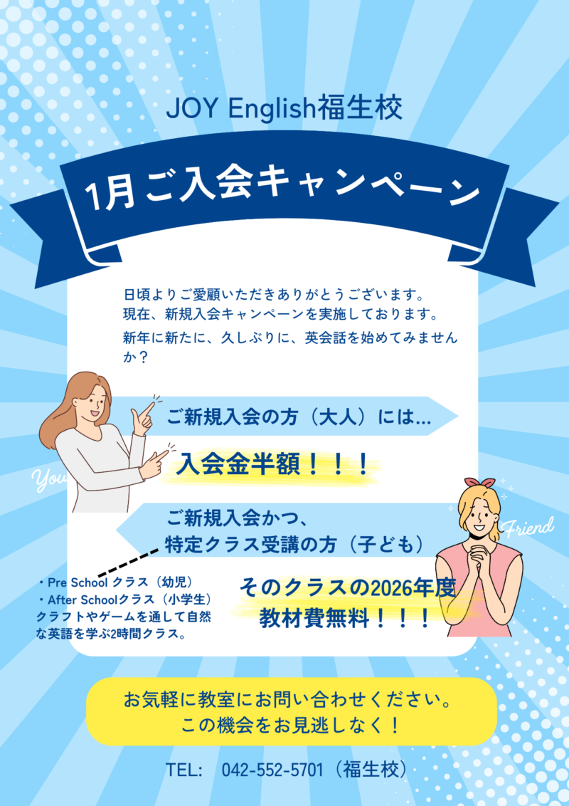 1月のご入会キャンペーン 投稿日: 2026年1月12日 投稿者: JOYEnglish こんにちは。福生校です。 1月のご入会キャンペーンを実施しております。 新年新たに英会話にチャレンジしてみませんか?! ご新規入会かつ、特定クラスご受講の方(子ども)は、2026年度教材費を無料とさせていただきます! また、ご新規入会の方(大人)には、入会金半額でご案内いたします!! この機会にぜひお問い合わせください!!(TEL:042-552-5701)